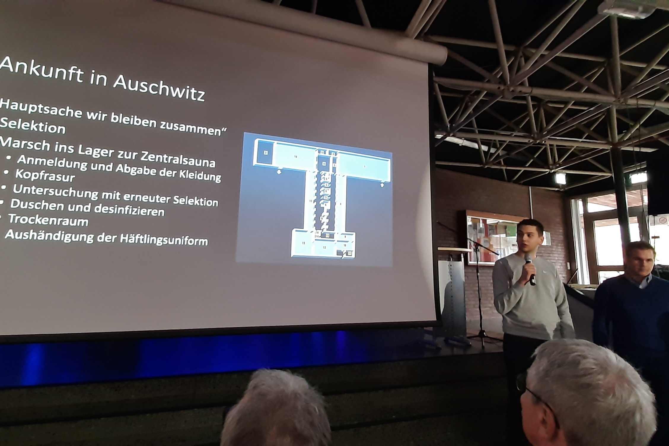 Nachdem die Gedenkfeier von der ehemaligen Schülerin Muriel Kühl mit einem selbst komponierten Klavierstück eingeleitet worden war, hielt Schulleiter Michael Kluge eine eindringliche Rede (PDF), bei der er den Bogen bis in die heutige Zeit spannte. Mia Steiniger vom Gymnasium Anna-Sophianeum fasste die Gedanken zum Gedenktag zusammen, Antonia Schrader, Victoria Bürger, Leon Nowack und Laura Francke von der Realschule Schöningen brachten den Zuhörerinnen und Zuhörern die Biografien der ermordeten Mitglieder der Schöninger Familie Wolff nahe. Hauptredner der Veranstaltung waren die Auszubildenden Mika Burghardt und Justus Schatz von der Firma Volkswagen, die zusammen mit Leiter Axel Passeier die Gedenkstättenarbeit des Konzern und speziell seiner Auszubildenden vorstellten. Die Veranstaltung schloss mit der von Alina Könnecke vom Gymnasium Anna-Sophianeum vorgetragenen Friedensbitte sowie einer Bewusstmachung aller in der Zeit des Nationalsozialismus ermordeten Mitbürgerinnen und Mitbürger der Stadt Schöningen, die in ihrer schieren Länge noch einmal die grauenhafte Nähe und das Ausmaß der historischen Ereignisse erlebbar machte.