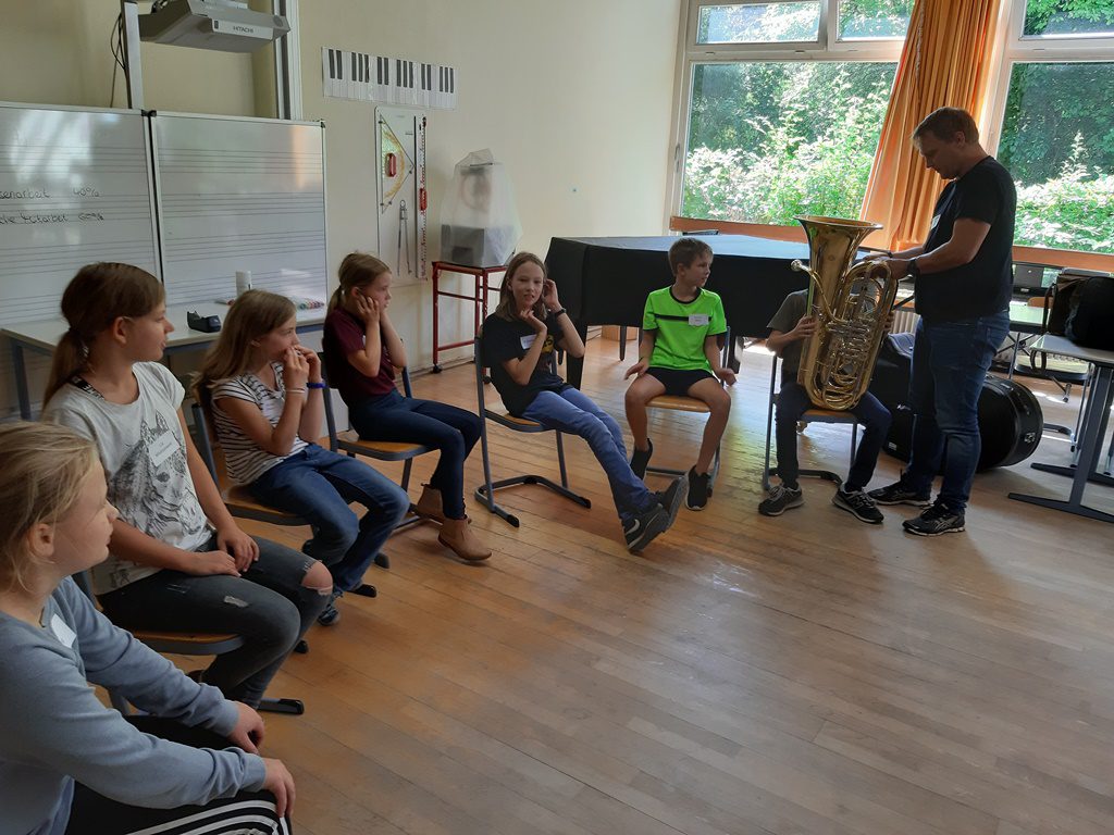 Gespannte Gesichter, freudige Erwartung, eine leichte Aufregung – diese Bilder und Stimmungen liegen hinter den 20 Schülerinnen und Schülern der neuen Bläserklasse 5BL am Gymnasium Anna-Sophianeum. Kurz nach deren Schulbeginn am 15. August 2019 konnte dank der Kooperation mit der Kreismusikschule Helmstedt e.V. bereits eine Woche später das Instrumentenkarussell für die neuen Musiker stattfinden. In Gruppen eingeteilt probierten sie alle zur Verfügung stehenden Instrumente wie Querflöte, Klarinette, Saxophon, Trompete, Posaune und Tuba aus und lernten die Instrumente etwas näher kennen. Doch wer die Wahl hat, hat bekanntlich auch die dazugehörige Qual. Am Ende des Instrumentenkarussells mussten die Schülerinnen und Schüler 3 Instrumente angeben, die sie gerne in den nächsten zwei Jahren lernen möchten. Aus diesen Wünschen sowie den kompetenten Einschätzungen der Instrumentallehrer der Kreismusikschule Helmstedt e.V. wurde dann eine spielfähige Besetzung geformt, die nun das größte Bläserklassenblasorchester einer einzelnen Bläserklasse seit Beginn des Bläserklassenprojektes am Gymnasium Anna-Sophianeum bildet. Mit sechs Querflöten, drei Klarinetten und drei Saxophonen ist das Register der Holzblasinstrumente sowohl in der Höhe als auch in der Tiefe gut ausgestattet. Neben vier Trompeten bilden drei Posaunen und eine Tuba ein überzeugendes klangliches Fundament des Orchesters.