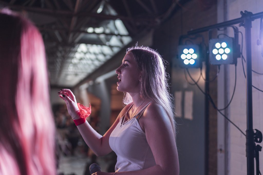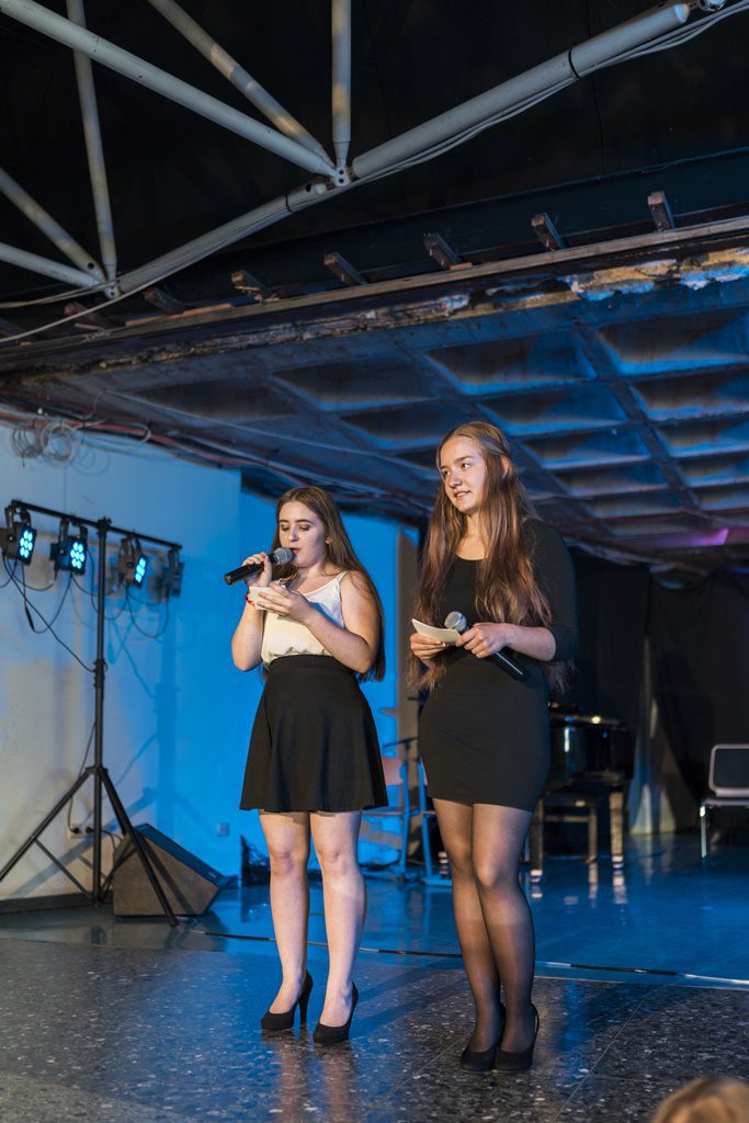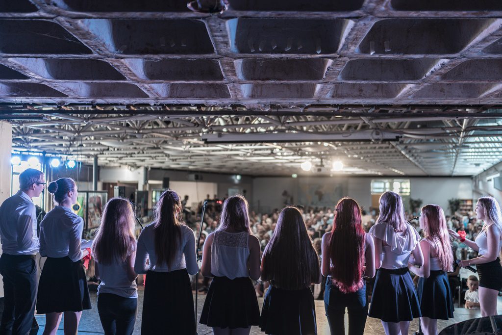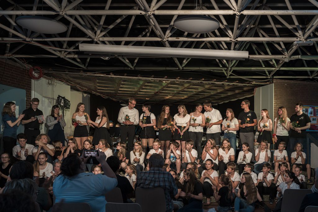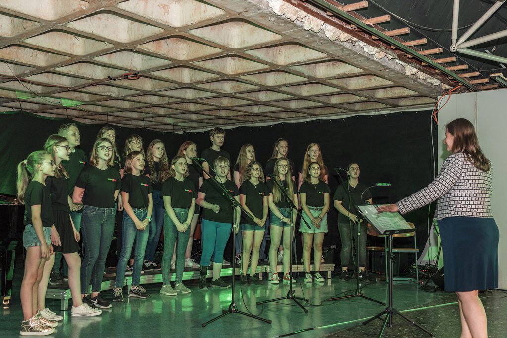 Der Oberstufenchor, unter der Leitung von Evelyn Winnekens, trat in dieser Zusammensetzung zum letzten Mal auf. Viele der Schülerinnen und Schüler sind Abiturienten des Jahrgangs 2019. Überwiegend selbständig hatten sie mit Abiturientin und Musikmentorin Shari Schwitters den großen Filmhit This is me von Benj Pasek und Justin Paul aus dem Film „The Greatest Showman“ einstudiert und eine reife fünfstimmige Leistung vorgestellt. Die selbstbewusste Aussage und Darbietung des Songs übertrug sich auf das begeisterte Publikum, das die Sängerinnen und Sänger mit langanhaltendem Applaus belohnte.