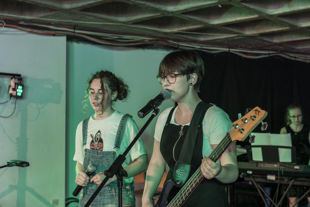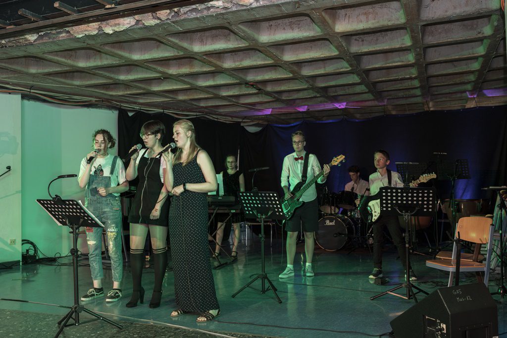 Die zweite Hälfte des Sommerkonzerts begann erneut mit lateinamerikanischen Rhythmen: die Schulband SplitID unter der Leitung von Christopher Englisch spielte und sang Camila Cabellos Havanna rhythmisch sicher und stimmlich stark. Souverän präsentierten sie dem begeisterten Publikum zwei weitere Songs: Girls like Girls von Hayley Kijoko und 2x von Mathea.