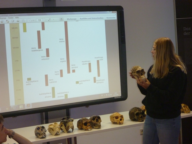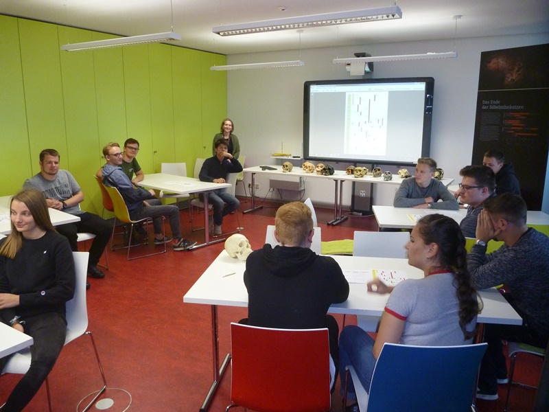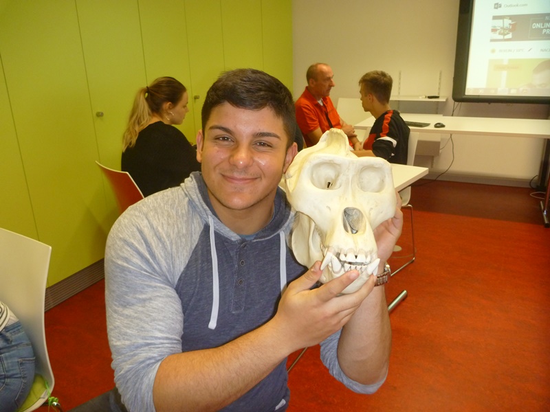 Im Rahmen der Unterrichtsreihe „Evolution des Menschen“ besuchten am 18.10.2018 die Schülerinnen und Schüler der beiden Biologiekurse der Oberstufe gemeinsam mit Frau Anspach-Wolf und Herrn Kiehne das paläon in Schöningen. Vor Ort erhielten die Kursschüler zunächst während einer fachwissenschaftlichen Führung durch die Ausstellung einen vertieften Einblick in die stammesgeschichtliche Entwicklung des Menschen. Im Anschluss konnten die Schülerinnen und Schüler ihr erworbenes Wissen dann direkt in einem paläoanthropologischen Bestimmungskurs anwenden und Schädelabgussmodelle menschlicher Vorfahren anhand charakteristischer Merkmale in einen Stammbaum einordnen.
