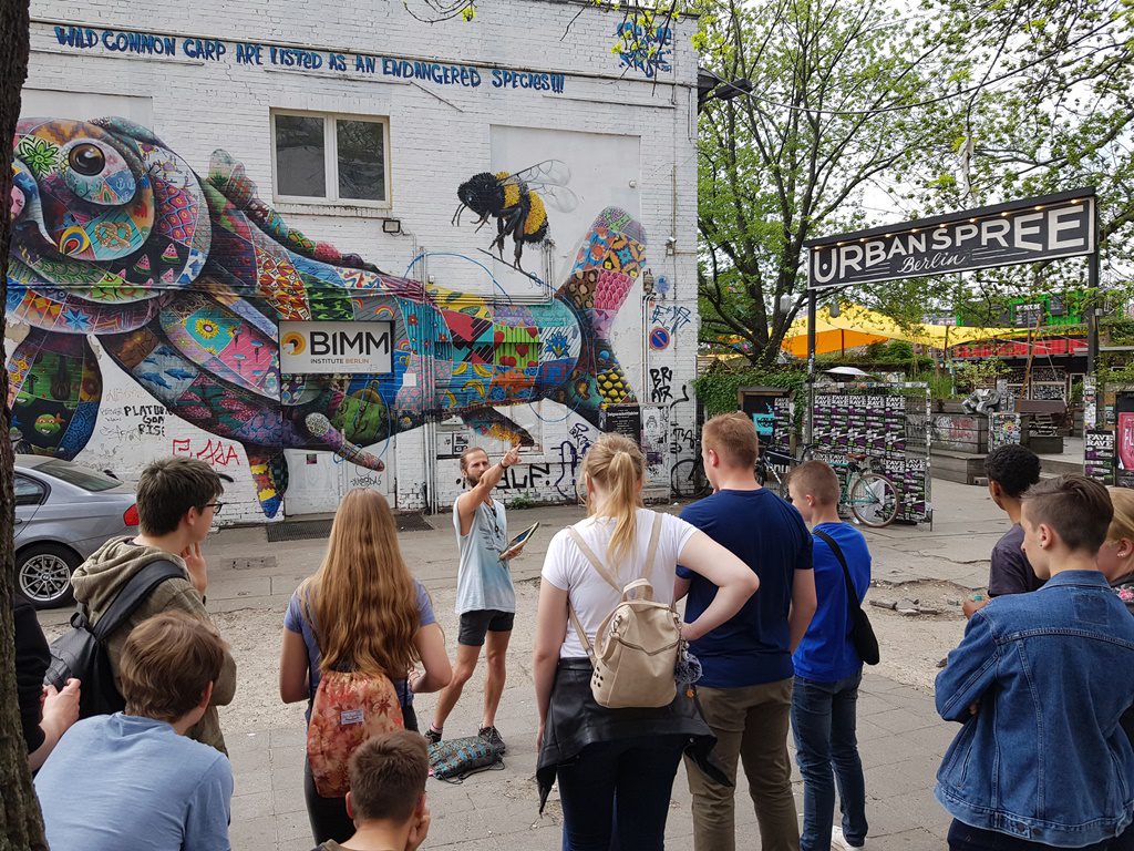 Die 10b begab sich fernab von den touristischen Zentren der Stadt mit dem Buchautor und Stadtführer Tobi Allers auf eine Street-Art-Entdeckungstour. Auf der Grenze von Kunst und Politik balancierte die Klasse von Herrn Sohr zwischen Kreuzberg und Friedrichshain an verschiedenen Kunstwerken im öffentlichen Raum vorbei. Schmiererei oder Graffiti? Straftat oder politischer Protest? Verteidigung von Freiräumen oder Hausbesetzung? Viele Fragen, die heute – vor allem unter dem Stichwort Gentrifizierung – in Berlin diskutiert werden, fanden Eingang in diesen Rundgang.