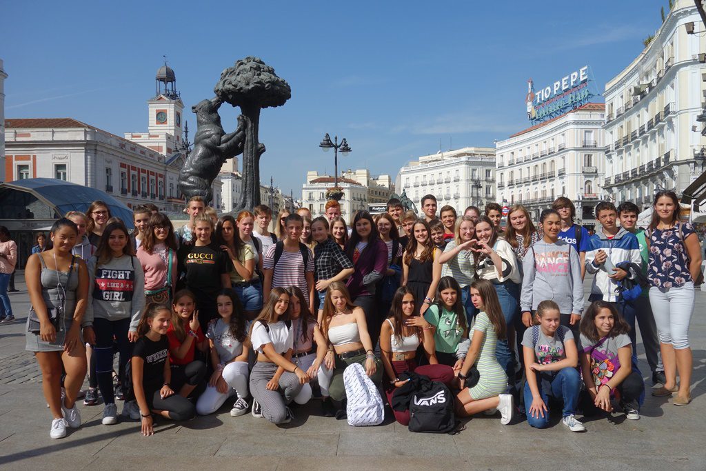 Die Ankunft erfolgte mit dem Zug von Coslada über Atocha, einem der größten Bahnhöfe Madrids, zur U-Bahnstation Sol, die zur berühmten Einkaufsstraße Gran Vía hin verlassen wurde. Sie beinhaltet zahlreiche Boutiquen sowie Restaurants, Theater und Kinos und ist somit ein beliebtes Touristenziel. Weiter ging es zur Puerta del Sol, übersetzt „Sonnentor“. Ehemals ein Eingangsbereich in die Stadt, ist es heute ein öffentlicher Platz und beherbergt zahlreiche berühmte Statuen, wie El Oso y El Madroño bzw. der Bär und der Erdbeerbaum, die Statue des Königs Carlos III. sowie das aus dem 19. Jahrhundert erhaltene Werbeschild der „Tio Pepe“. Viele Schüler und Schülerinnen fotografierten auch den Kilómetro cero, der laut Legende den Mittelpunkt Spaniens bzw. den Ursprung aller spanischen Hauptverkehrs-straßen kennzeichnen soll. Am Rand des Platzes befindet sich La Mallorquina, eine der besten Bäckereien Madrids. Hier durften sich die Schüler Backwaren oder Geschenke für zuhause kaufen, bevor es zum Plaza Mayor weiterging.