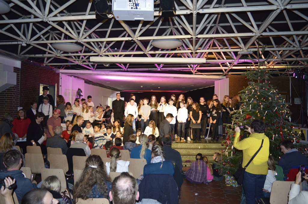 Im zweiten Teil des Abends präsentierte das Schulorchester, nun unter der Leitung von Evelyn Winnekens, den mitreißenden James-Bond-Titel „Skyfall“ sowie ein beschwingtes Swing-Medley aus amerikanischen Weihnachtsliedern. Der Schulchor, dirigiert von Berit Lobach, sorgte mit besinnlichen Stücken wie „Mary Did You Know“ für einen stimmungsvollen Abschluss des Abends. Zum krönenden Finale musizierten alle Ensembles gemeinsam mit dem Publikum das Lied „O Tannenbaum“, was allen Besuchern einen weihnachtlichen Ohrwurm mit auf den Heimweg gab.