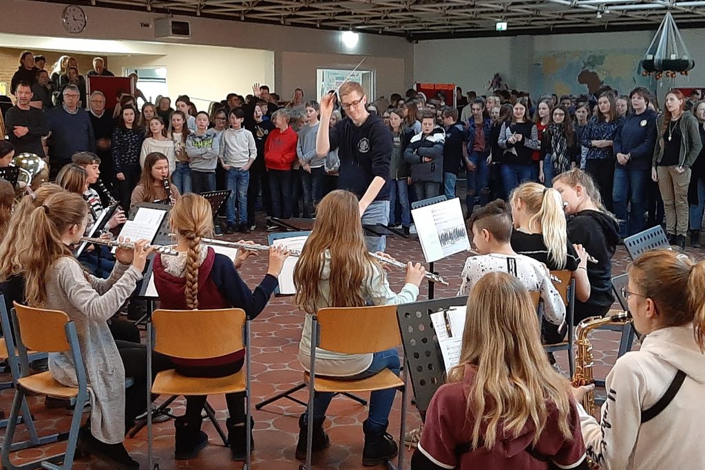 Besonderheiten für das Orchester waren zum Einen die Stimmproben am Dienstag Vormittag, bei denen uns zwei Instrumentallehrer der Kreismusikschule unterstützt haben und instrumentenspezifische Tipps geben konnten. Zum Anderen besuchte uns am Abend das Blasorchester „Klingend Bb“ aus Königslutter/Braunschweig, sodass die Jugendlichen aus dem Schulorchester nach schon sechs Probenstunden an diesem Tag gemeinsam mit den Erwachsenen von „Klingend Bb“ zwei Stunden lang geprobt und dabei zusammen Stücke gespielt haben, was für alle gut 50 Musizierenden eine tolle Erfahrung war.