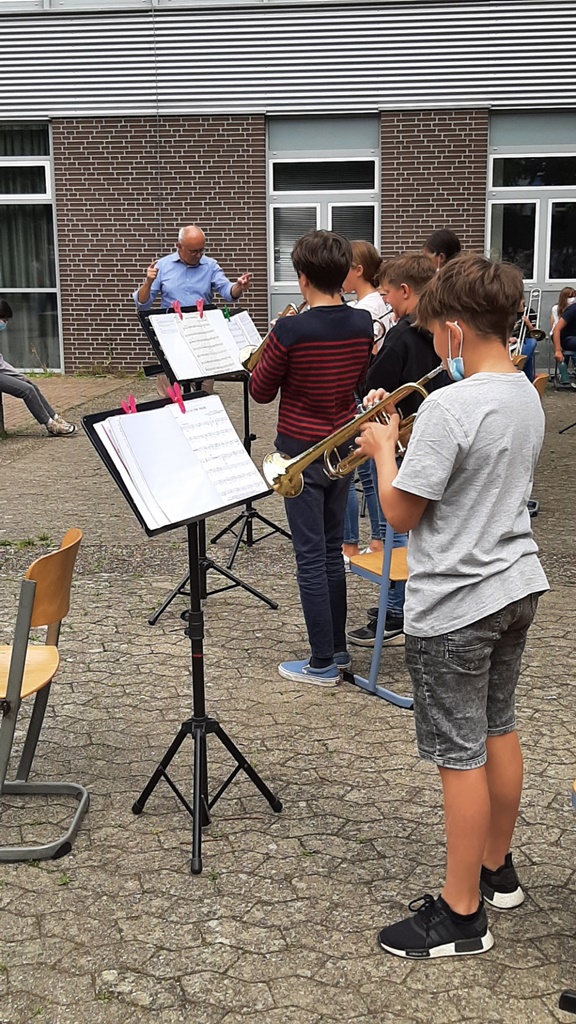 Auch die Bläserklasse 6 (Leitung Frau Ecksturm-Rudd), die sich mit diesem Konzert von ihrer zweijährigen Bläserklassenzeit verabschiedete, zeigte noch einmal, wie weit man mit gemeinsamen Proben und Spielen kommen kann. Fast die Hälfte BK6-Schülerinnen und -Schüler werden im kommenden Schuljahr das Orchester verstärken – ein beeindruckendes Beispiel für die nachhaltige musikalische Förderung an unserer Schule.