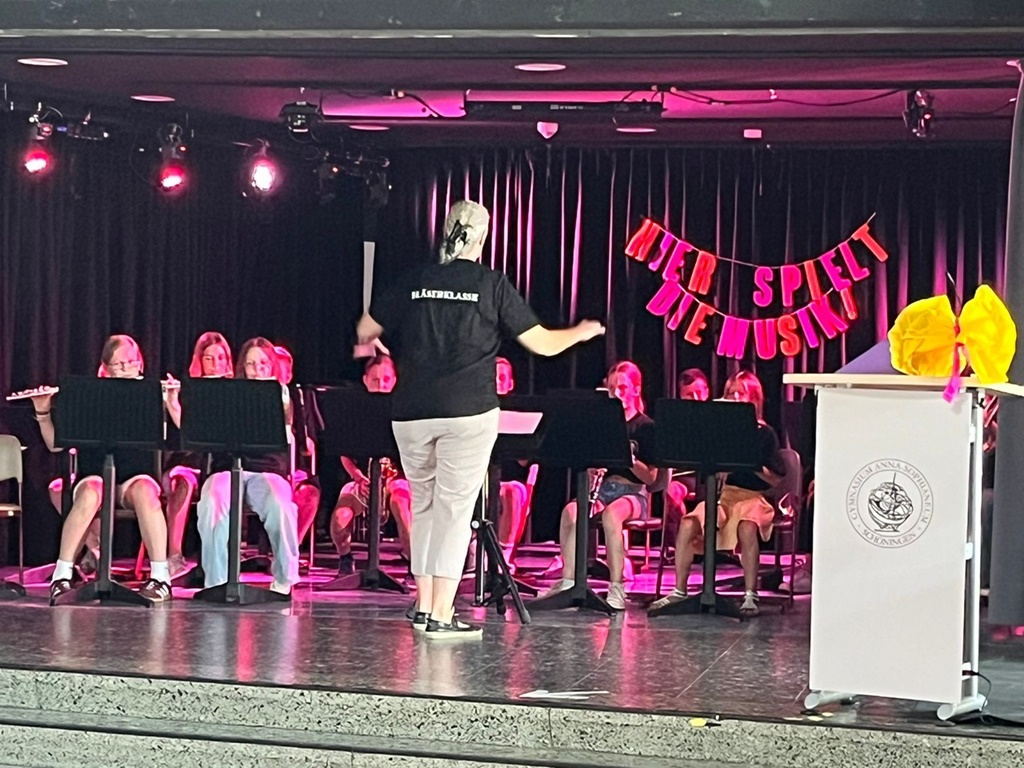 Auch die Bläserklasse 6 (Leitung Frau Ecksturm-Rudd), die sich mit diesem Konzert von ihrer zweijährigen Bläserklassenzeit verabschiedete, zeigte noch einmal, wie weit man mit gemeinsamen Proben und Spielen kommen kann. Fast die Hälfte BK6-Schülerinnen und -Schüler werden im kommenden Schuljahr das Orchester verstärken – ein beeindruckendes Beispiel für die nachhaltige musikalische Förderung an unserer Schule.