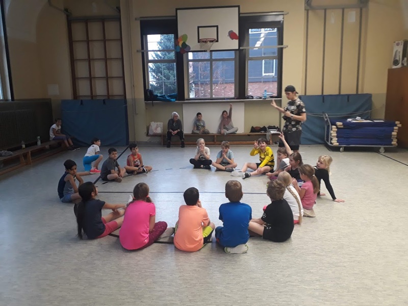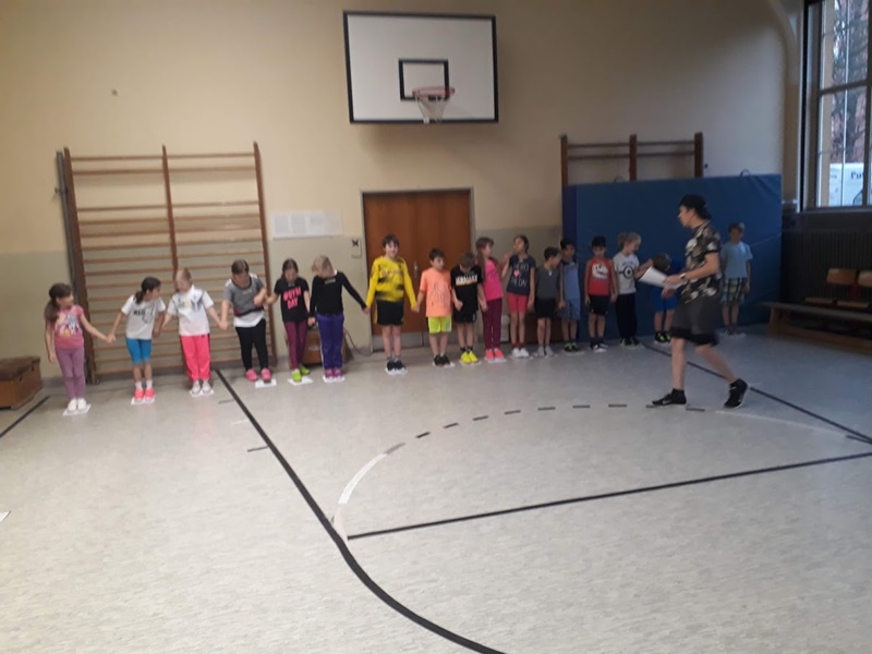 Dies sollte den Hauptteil der Stunde einleiten. Es wurde eine Choreographie geplant, die zuerst in einzelnen Gruppen einstudiert wurde und dann zusammen vor einem Spiegel mit einem Takt verinnerlicht wurde. Am Ende wurde wieder eine Reflexion durchgeführt, dort hat die Klasse das Gelernte nochmal genannt. Die Kinder hatten sehr viel Spaß bei den beiden Stunden und die Intention des sozialen Projektes kam bei den Kindern gut an.