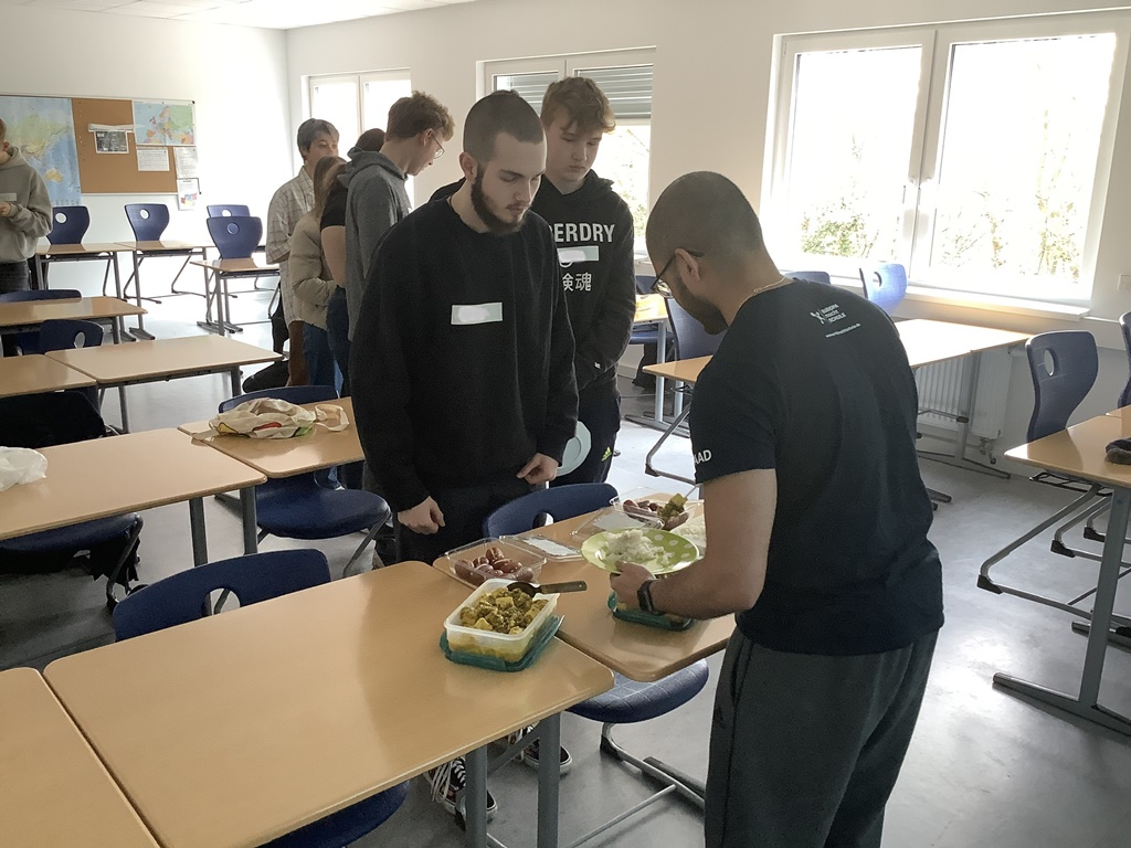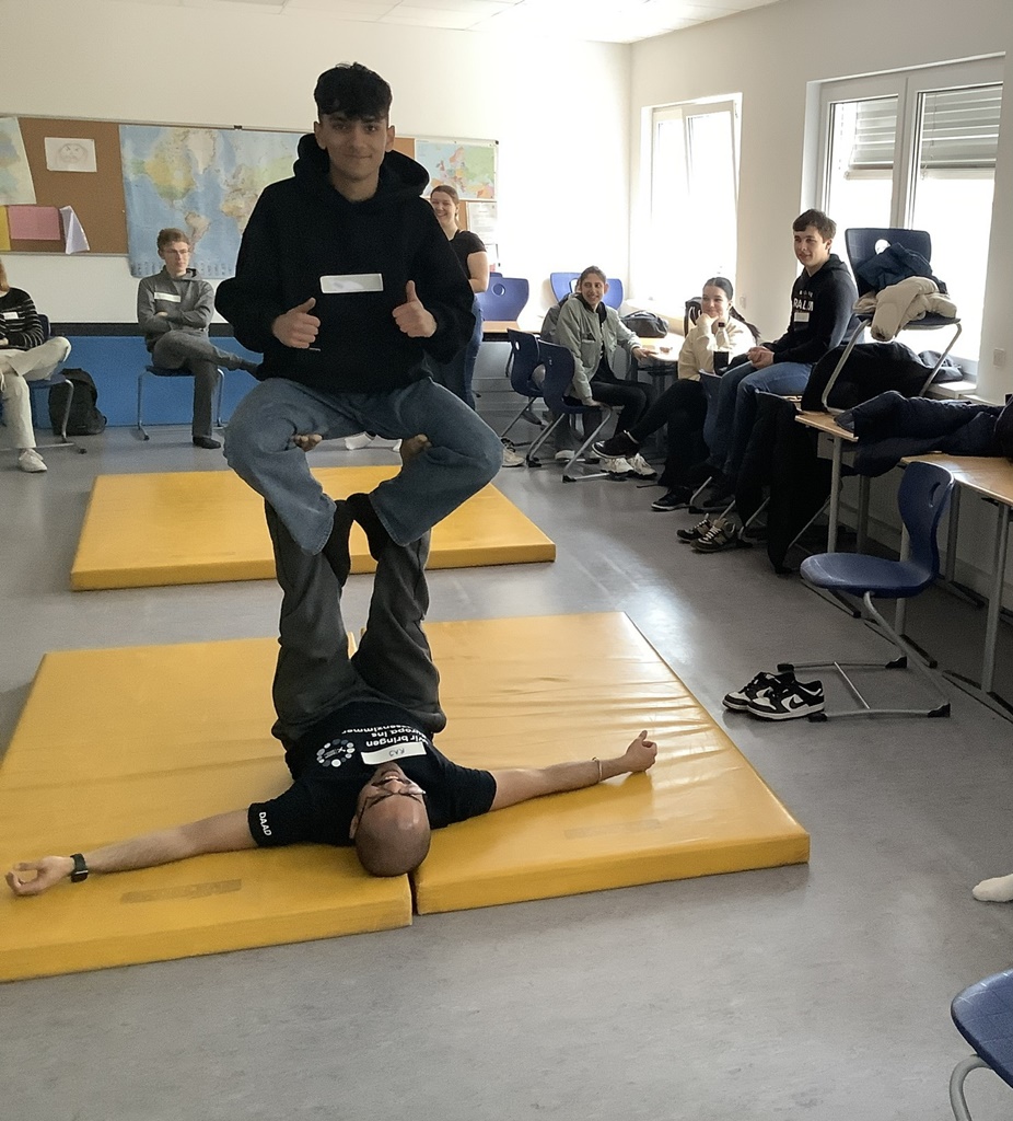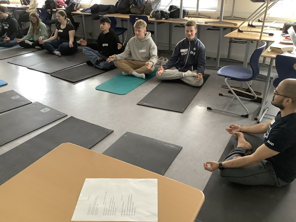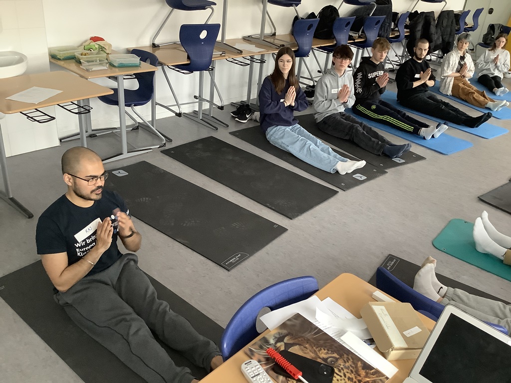 Er unternahm mit dem 10. Jahrgang des WN-Kurses von Herrn Wagener eine abwechslungsreiche Vortragsreise zu den vielfältigen Sprachen des Subkontinents und begeisterte so manchen Teilnehmer mit seinen kulinarischen Tipps zur Zubereitung von bewusstseinserweiternden Getränken, die wohl gerne im Rahmen religiöser Feierlichkeiten in Indien eingenommen werden. Nach dem Vortrag wurde es praktisch. Zunächst wurde versucht auf Hindi und Bengali zu singen. Im Anschluss gab es eine Kostprobe indischen Essens und nach einer kurzen Pause wurde mit Yoga entspannt. Der Höhepunkt war wohl das Akroyoga. Eine Abwandlung des normalen Yoga, bei dem allerdings meist zu zweit akrobatische Yogaübungen vollzogen werden. Die Teilnehmer hatten hierbei besonders Spaß und so mancher war wohl selbst von seinen akrobatischen Fähigkeiten überrascht. Ein großes Dankeschön geht an Raj für einen gelungenen, vielfältigen und vor allem entspannten Projekttag. Es war sehr schön, nach gefühlt langer Zeit wieder eine Kulturbegegnung in Präsenz zu haben. Danke an das EMS-Team für die Organisation und natürlich an die Schülerinnen und Schüler für ihre Teilnahme!