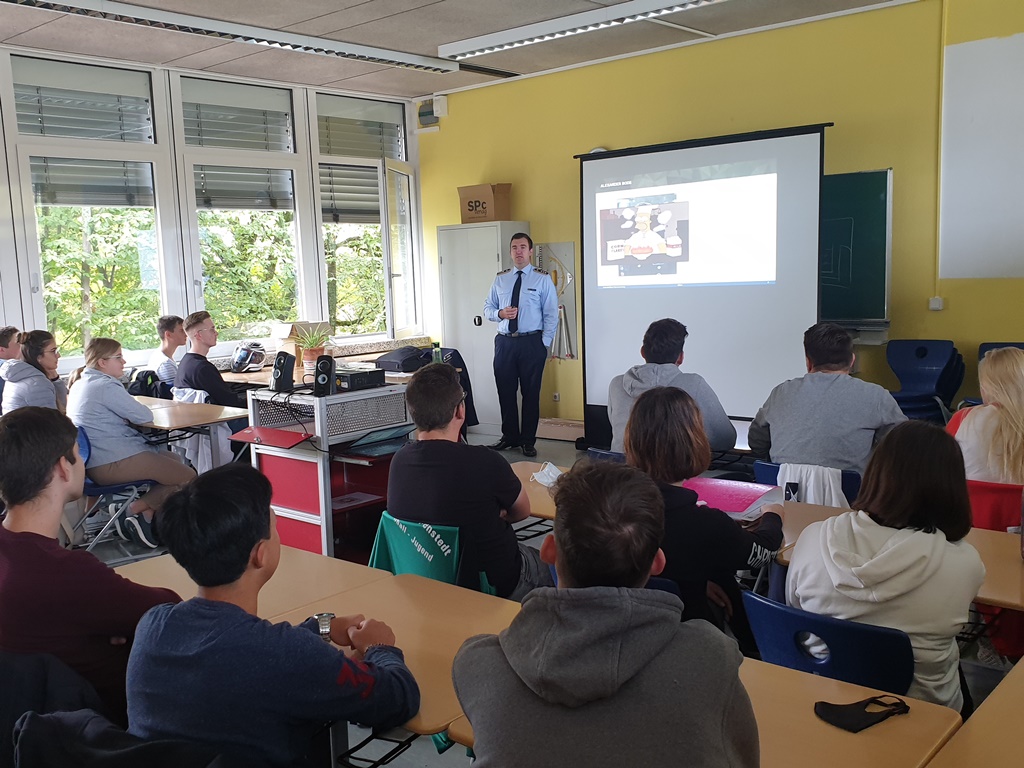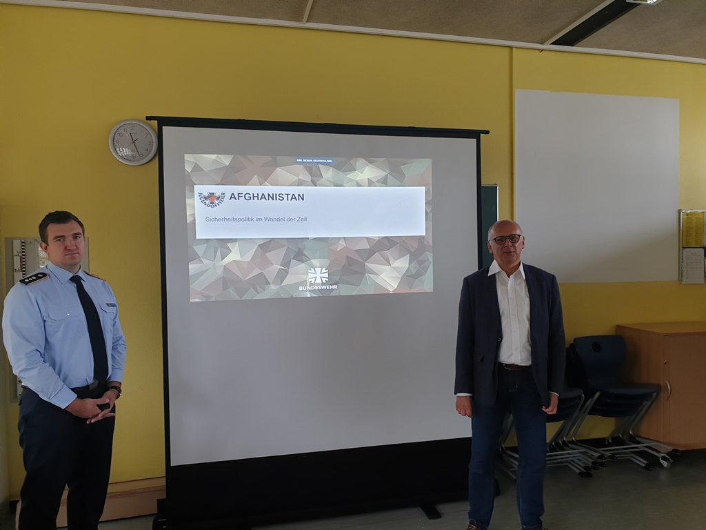 Im Rahmen des Semesterthemas „Internationale Friedens- und Sicherheitspolitik“ referierte am 25.09.2020 Hauptmann Bode über den sogenannten „Islamischen Staat“ sowie den Afghanistaneinsatz der Bundeswehr im Rahmen der Operation „Resolute Support“, wobei er auch auf eigene Einsatzerfahrungen zurückgreifen konnte. Im anschließenden Gespräch bot sich den Schülerinnen und Schülern die Gelegenheit, auch kritische Fragen an den Referenten zu stellen.