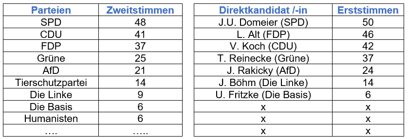Die Auszählung der abgegebenen Erst- und Zweitstimmen ergab folgende Verteilung: