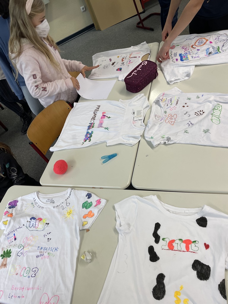 Am 07. Oktober 2021 führten drei Schülerinnen des 13. Jahrgangs, Josefine Preim, Annett Brüning und Alyssa Brüning, zusammen mit der 5c ihr soziales Projekt „Kennenlernshirts“ erfolgreich durch. Dabei konnte jedes Kind ein eigenes T-Shirt gestalten, auf dem es sich mit zuvor gesammelten Kategorien vorstellte. Dazu zählten beispielsweise Name und Wohnort, aber auch Lieblingsfarbe oder Traumberuf.
