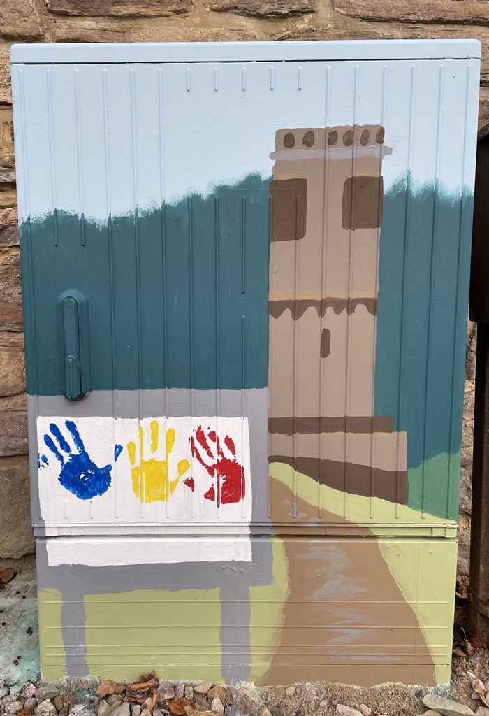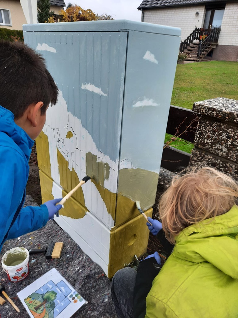 Die vier Schülerinnen, Ronja Bach, Belana Weidner, Marlene Günther und Juliet Ibeh, trafen sich am Donnerstagmorgen in der Grundschule mit der Klasse 4b, um den Verlauf des Tages zu besprechen. Um kurz nach neun teilten sich die Kinder, gemeinsam mit ihren Betreuern, in Gruppen ein. Nun konnte es losgehen: Das Ziel waren vier Stromkästen in Jerxheim, die die in Schöningen ansässige Avacon bereitgestellt hatte, welche zuvor von Ronja Bach mit „Malen nach Zahlen“-Designs versehen worden waren. Die Pinsel für das Projekt wurden vom Baumarkt Toom in Schöningen bereitgestellt. Mit verschiedenen Farben ausgerüstet ging es nun zu den vorbereiteten Stromkästen, um sie künstlerisch zu gestalten. Zwischendurch gab es eine Pause in der Grundschule, um die fleißigen Künstler aufzuwärmen. Hier durften die Kinder ihren eigenen Stromkasten auf dem Papier planen. Nur das Novemberwetter machte den Mädchen einen Strich durch die Rechnung und so verlief ein Teil der Farbe an den Kästen, weswegen sie, wenige Tage später, von den Oberstufenschülerinnen überarbeitet werden mussten. Nun bekamen die Kinder die Gelegenheit, sich mit ihren Handabdrücken auf den Kästen zu verewigen.
