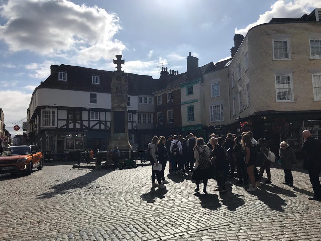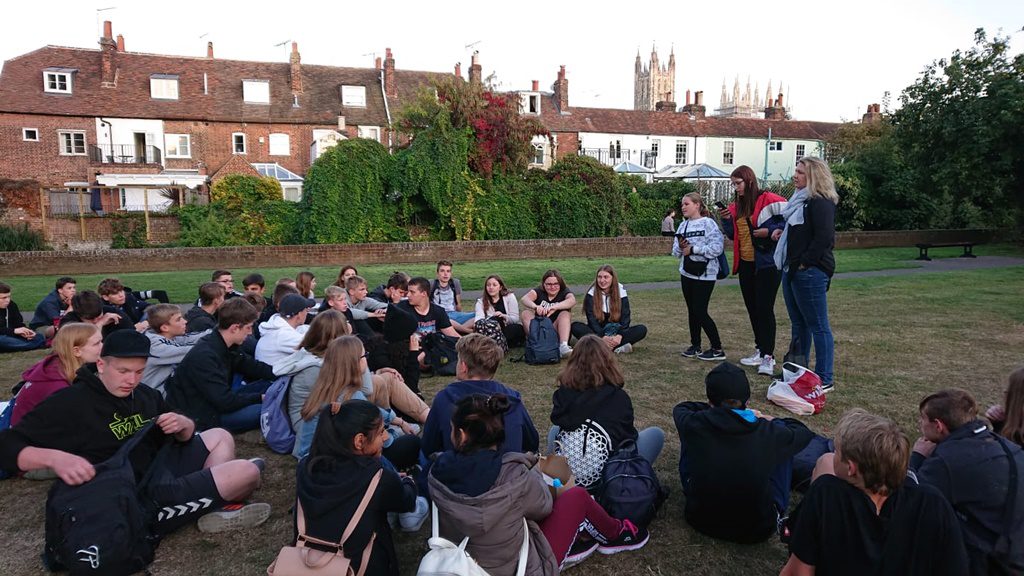 Der letzte Tag in England brach an. Nach dem Aufstehen wurden die restlichen Sachen in den Koffer gepackt, denn am spätenAbend würde schon die Fähre von Dover nach Calais los fahren. Nach dem Frühstück, welches bei manchen aufgrund mangelnder Zeit ausfiel, mussten wir uns leider schon von den Gastfamilien verabschieden, was bei ein paar Schülern sogar mit Tränen in den Augen endete. Zwar war die Zeit in Eastbourne wirklich toll, aber wir freuten wir uns doch schon alle auf Zuhause. Als dann alle von den Gastfamilien persönlich oder von einem Taxi zum Treffpunkt gefahren wurden, ging die Fahrt nach Canterbury, dem letzten Ziel unserer Reise los. Die zweistündige Fahrt nach Canterbury wurde genutzt um ein wenig Schlaf der letzten Tage nachzuholen oder einfach noch ein wenig zu quatschen. Dort angekommen, ging es als erstes zur Christ Church, der dort gelegenen Kathedrale, wo wir mit einer Foto Rally durch Canterbury starteten. In Gruppen aufgeteilt ging die Suche nach bestimmten Orten in Canterbury los. Die Aufgabe: Lustige Fotos mit den Freunden vor den zu findenden Gebäuden oder Denkmälern schießen und einfach Spaß haben. Ziel dieser Rallye war z.B. die King’s School, eine der bekanntesten Privatschulen Englands, wo alle Schüler Schuluniformen mit einem Schullogo tragen.Die letzte Station und Ziel der Foto Rally war McDonalds, wo wir uns eine Stärkung gönnen konnten bevor es ins nahegelegene Kino Odeon ging. Der ausgesuchte Film, Downton Abbey, teilte die Gruppe in zwei Lager. Manche fanden das Drama unglaublich spannend und interessant, andere haben die zwei Stunden, welche der Film andauerte, zum Schlafen genutzt. Die nächste Stunde hatten wir Zeit, uns Proviant für die anstehende Fahrt zu besorgen und nochmals etwas Kraft zu tanken. Nachdem wir uns alle wieder zusammengefunden hatten, gingen wir Richtung Parkpaktz, wo unser Bus stand, in dem unser Busfahrer seine wohlverdiente Pause machte. Unterwegs machten wir kurz in einem Park halt, um die Pop-Up-Questions des heutigen Tages zu beantworten. Als alle Fragen erfolgreich beantwortet worden waren, ging es weiter zum Parkplatz, wo der Bus schon auf uns wartete. Der Weg von Canterbury nach Dover, zur Fähre, war nicht so lang. Deswegen ging die Fahrt mit Quatschen schnell vorbei. Nach einer kurzen Kontrolle ging es dann schon weiter auf die Fähre. Die zwei stündige Fahrt verbrachten wir in kleinen Gruppen an Deck oder im Inneren des Schiffes. Um ca. 00.00 Uhr kam die Fähre in Calais an und die Fahrt nach Hause konnte fortgesetzt werden. Allmählich wurde es stiller im Bus, die Lichter gingen aus und wir versuchten, nach den letzten anstrengenden Tagen ein bisschen zur Ruhe zu kommen. (Vanessa Kuhlmann / Talisa Pentzek)