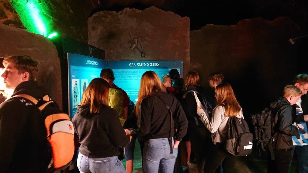Trotz des Abschiedes stieg die Stimmung im Bus innerhalb einer Sekunde von null auf hundert. Es wurden Musikboxen angemacht und lautstark mitgesungen. Alle waren sehr gespannt auf England und freuten sich schon. Die Fahrt war dann allerdings doch länger als gedacht und irgendwann kehrte auch Stille ein. Am nächsten Morgen kamen wir an der Fähre an und unser Ziel rückte immer näher. Auf der Fähre konnten wir uns erstmal ein bisschen ausruhen, unsere Beine vertreten oder auch in einer größeren Runde einfach mal Karten spielen. Als dann die White Cliffs of Dover zu sehen waren, kamen alle raus um sich die wunderschöne Landschaft anzuschauen. Ein paar Schüler wurden von der Landschaft so inspiriert, das sie anfingen zu singen und eine Art kleines „Riff Off“ veranstalteten. In Dover angekommen ging es dann zu einer Besichtigung des „Dover Castles“. Wir schauten uns zum Beispiel die unterirdischen „Wartime Tunnels“ an, die mehr als 15 Meter unter der Erde sind. Keine Sorge, alle haben es letztendlich irgendwie dann doch noch raus geschaft. Danach haben wir uns auch endlich auf den Weg nach Eastbourne gemacht. Die Fahrt dauerte nochmal über zwei Stunden. Nach fünf Minuten im Bus schiefen dann abermals die meisten Schüler ein und es wurde wieder still. Wir waren etwas früher als geplant in Eastbourne und durften deshalb noch das Shoppingcenter erkunden. Der Moment des Treffens mit den Gastfamilien rückte immer näher und der Puls der Schüler wollte sich einfach nicht mehr beruhigen. Nach und nach wurden die Schüler abgeholt und die Aufregung stieg. Irgendwann war dann auch meine Gastfamilie dort und sie waren wirklich sehr nett. Alle schrieben sofort miteinander über ihre Familien und waren sehr begeistert. Manche gingen abends noch die anderen besuchen, aber manche blieben auch einfach in ihren Gastfamilien, weil sie sich dort so wohl fühlten. (Victoria von Wantoch)