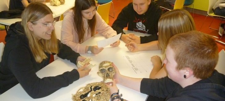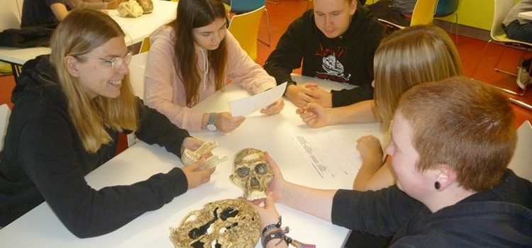 Im Rahmen der Unterrichtsreihe „Evolution des Menschen“ besuchten am 18.10.2018 die Schülerinnen und Schüler der beiden Biologiekurse der Oberstufe gemeinsam mit Frau Anspach-Wolf und Herrn Kiehne das paläon in Schöningen. Vor Ort erhielten die Kursschüler zunächst während einer fachwissenschaftlichen Führung durch die Ausstellung einen vertieften Einblick in die stammesgeschichtliche Entwicklung des Menschen. Im Anschluss konnten die Schülerinnen und Schüler ihr erworbenes Wissen dann direkt in einem paläoanthropologischen Bestimmungskurs anwenden und Schädelabgussmodelle menschlicher Vorfahren anhand charakteristischer Merkmale in einen Stammbaum einordnen.