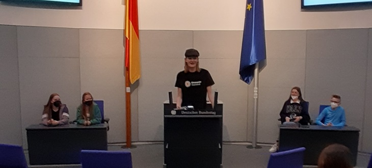 Highlight war anschließend der Besuch eines kleinen (nachgebauten) Parlaments in der Mitte des Doms. Hier haben sich die Schüler kurzerhand auf die Stühle der Parlamentsabgeordneten und -mitarbeiter gesetzt. Sogar das Rednerpult erfreute sich großer „Beliebtheit“. Schnell wurde so der kleiner Parlamentssaal zum „Klassenzimmer“ und wir haben mit großer Freude und Engagement den Aufbau sowie die Funktionen und Aufgaben des Parlaments in Deutschland wiederholt.