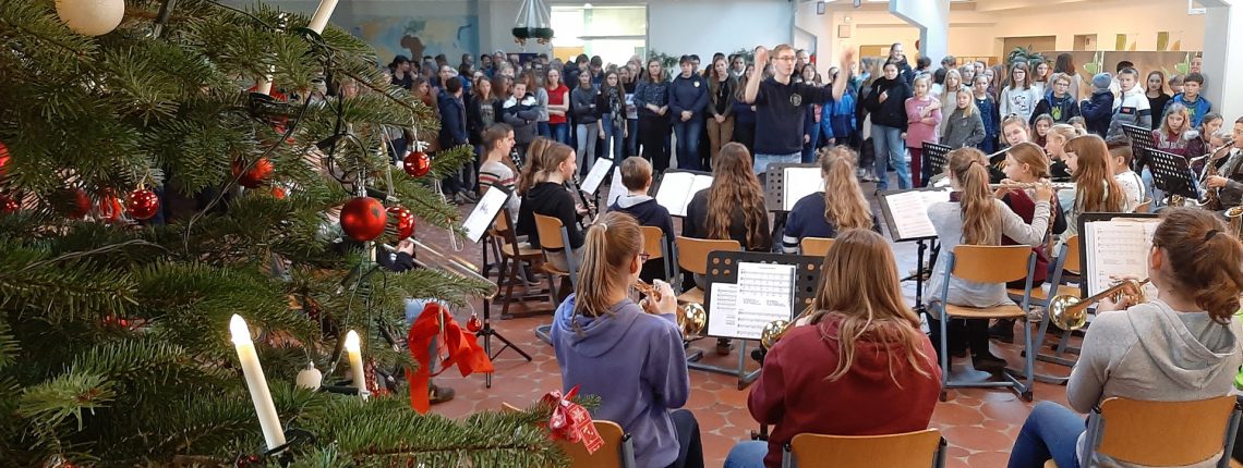 Im zweiten Teil des Abends präsentierte das Schulorchester, nun unter der Leitung von Evelyn Winnekens, den mitreißenden James-Bond-Titel „Skyfall“ sowie ein beschwingtes Swing-Medley aus amerikanischen Weihnachtsliedern. Der Schulchor, dirigiert von Berit Lobach, sorgte mit besinnlichen Stücken wie „Mary Did You Know“ für einen stimmungsvollen Abschluss des Abends. Zum krönenden Finale musizierten alle Ensembles gemeinsam mit dem Publikum das Lied „O Tannenbaum“, was allen Besuchern einen weihnachtlichen Ohrwurm mit auf den Heimweg gab.