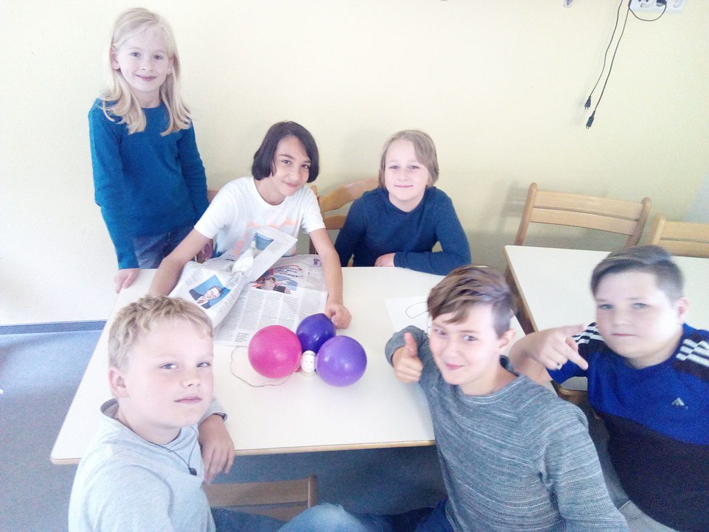 Am Mittwoch starteten wir nach dem Frühstück mit einem Wettbewerb: Jede Zimmergruppe sollte versuchen, mit Materialien wie Zeitungspapier, Schnur, Ballons und Kleberolle ein rohes Ei aus dem zweiten Stockwerk der Jugendherberge „fliegen“ zu lassen, so dass es unversehrt unten ankommt. Bewertet wurden Schnelligkeit im Konstruieren, Materialaufwand, die Präsentation der Überlegungen und der Zustand des Eis nach dem Flug. Das Gewinnerteam beförderte ihr Ei auch fast heil nach unten.