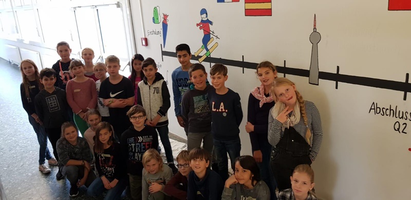 Am Freitag, den 09. November 2018, trafen wir uns also morgens um 7.45 Uhr mit der 5bl und begannen mit der Gestaltung der Wand. Während eine Gruppe mit der Verzierung beschäftigt war, hatten die anderen Gruppen die Aufgabe, aus selber vorbereiteten Infotexten Informationen über die verschiedenen Länder der späteren Fahrten zu sammeln. Pünktlich zum Schulschluss nach der 6. Stunde war die Wand bunt verziert und Steckbriefe zu allen Ländern klebten bunt verziert an der Tafel.