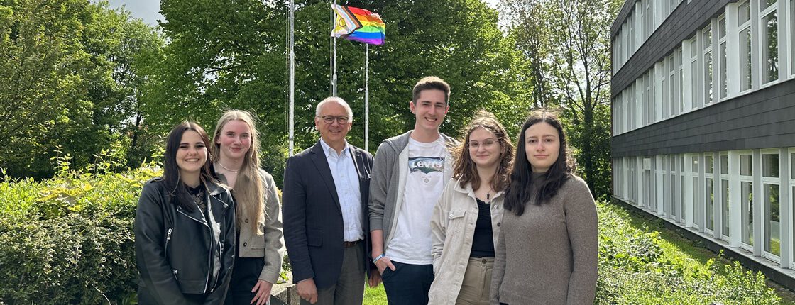 Die Vertreter:innen der Schülerschaft wollen auch allen queeren Menschen unserer Schule symbolisieren: Wir stehen hinter Euch! Unsere Schule ist ein Ort, wo jede:r sein kann und soll, wie man ist – und dies soll symbolhaft auch nach innen und nach außen getragen werden.Bestimmt fällt auf, dass die Flagge etwas anders aussieht, als die Regenbogenfahne, die man kennt. Die vor der Schule hängende beinhaltet noch weitere Farben in einer Dreiecksform. Dies soll auch Trans* Menschen, Inter* Personen und weitere Gruppen repräsentieren.