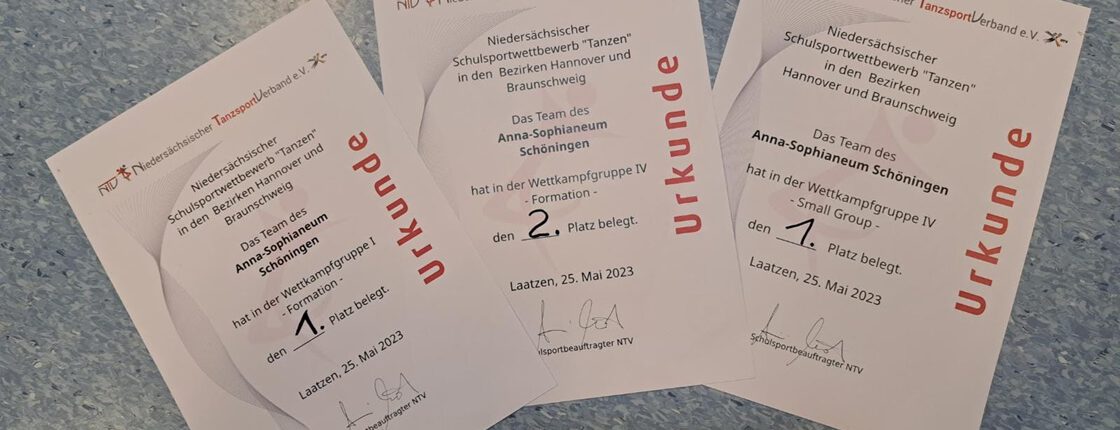 Am 25. Mai 2023 fand an der Albert-Einstein-Schule in Laatzen der „Niedersächsische Schulsportwettbewerb ‚Tanzen‘ für die Regionen Braunschweig und Hannover“ statt. Aufgrund unserer Kooperation mit dem TC Schöningen, in dessen Tanzsportabteilung viele unserer Schülerinnen beheimatet sind, konnten wir neben unserer Tanz-AG noch zwei weitere Formationen für diesen Wettbewerb melden. So machten sich am 25. Mai 27 tanzbegeisterte Schülerinnen unserer Schule mit ihrer Trainerin Bernadette Sievert vom TC Schöningen, Frau Gennrich und Frau Hansmeier auf den Weg in Richtung Hannover. Die Fahrzeit nutzten die aufgeregten Tänzerinnen, um Haare zu flechten und sich für den Auftritt zu schminken, und die erfahrenen Tänzerinnen versuchten, die Neulinge etwas zu beruhigen. Pünktlich zum Einlauf der Formationen kamen wir am Veranstaltungsort an. Die Tanz-AG, die sich zu Schuljahresbeginn neu formiert und in Laatzen ihren ersten öffentlichen Auftritt hatte, machte in der WK VI den Auftakt und kam direkt ins große Finale. In der WK I bewiesen unsere Schülerinnen, die auch Monumentos tanzen, ihr Können und die Tänzerinnen von Bisou traten bei den Small Groups an. Nach einem erfolgreichen zweiten Durchlauf stand das Ergebnis der Wertungsrichter fest und Überraschung und Freude waren groß: Unsere Tanz-AG erlangte bei ihrer allerersten Wettbewerbsteilnahme einen tollen 2. Platz, unsere Schülerinnen von Bisou und Moumentos waren noch erfolgreicher und konnten jeweils eine Urkunde über den 1. Platz in Empfang nehmen. Aufgrund ihrer Platzierung können die „Großen“ am 17. Juni am Bundeswettbewerb in Maintal teilnehmen. Herzlichen Glückwunsch an unsere erfolgreichen Tänzerinnen und ein herzliches Dankeschön an die Trainerinnen für ihren Einsatz.